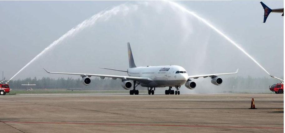 “过水门”仪式因两辆或两辆以上的消防车在飞机两侧喷射水雾时,会出现一个“水门”状的效果而得名。飞机“过水门”仪式,形式类似于国外军队列队红毯两侧的仪仗兵用军刀搭建的“门”,寓意“接风洗尘”,具有很高的礼仪级别。