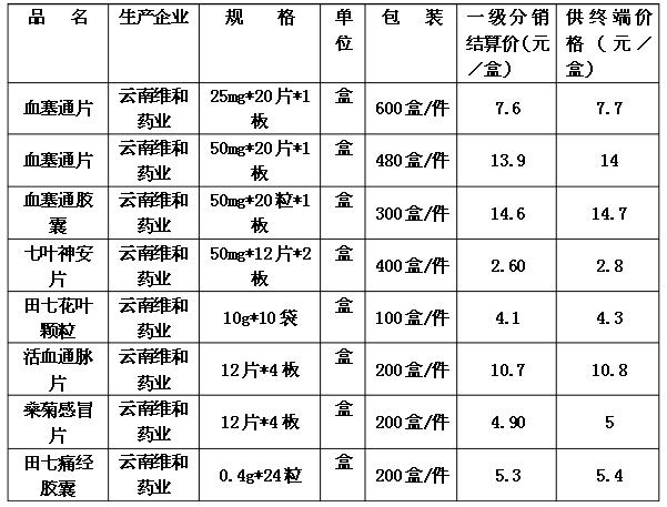 因三七原料持续暴涨,且原料货源紧张,为保证我公司及各合作客户的正常经营,现对我公司产品二级商业分销结算价格及出货销售价格体系调整如下: